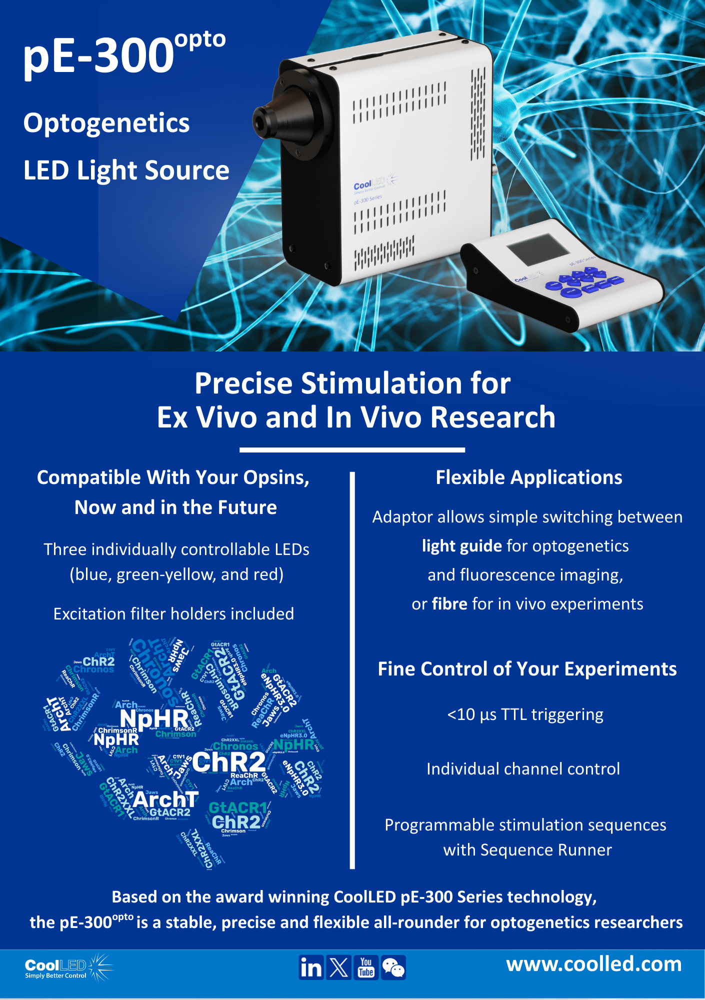Featuring three individually controllable LEDs (blue at 470 nm, green-yellow at 550 nm, and red at 635 nm), the pE-300opto covers the most popular opsins from ChR2 through to ChrimsonR.