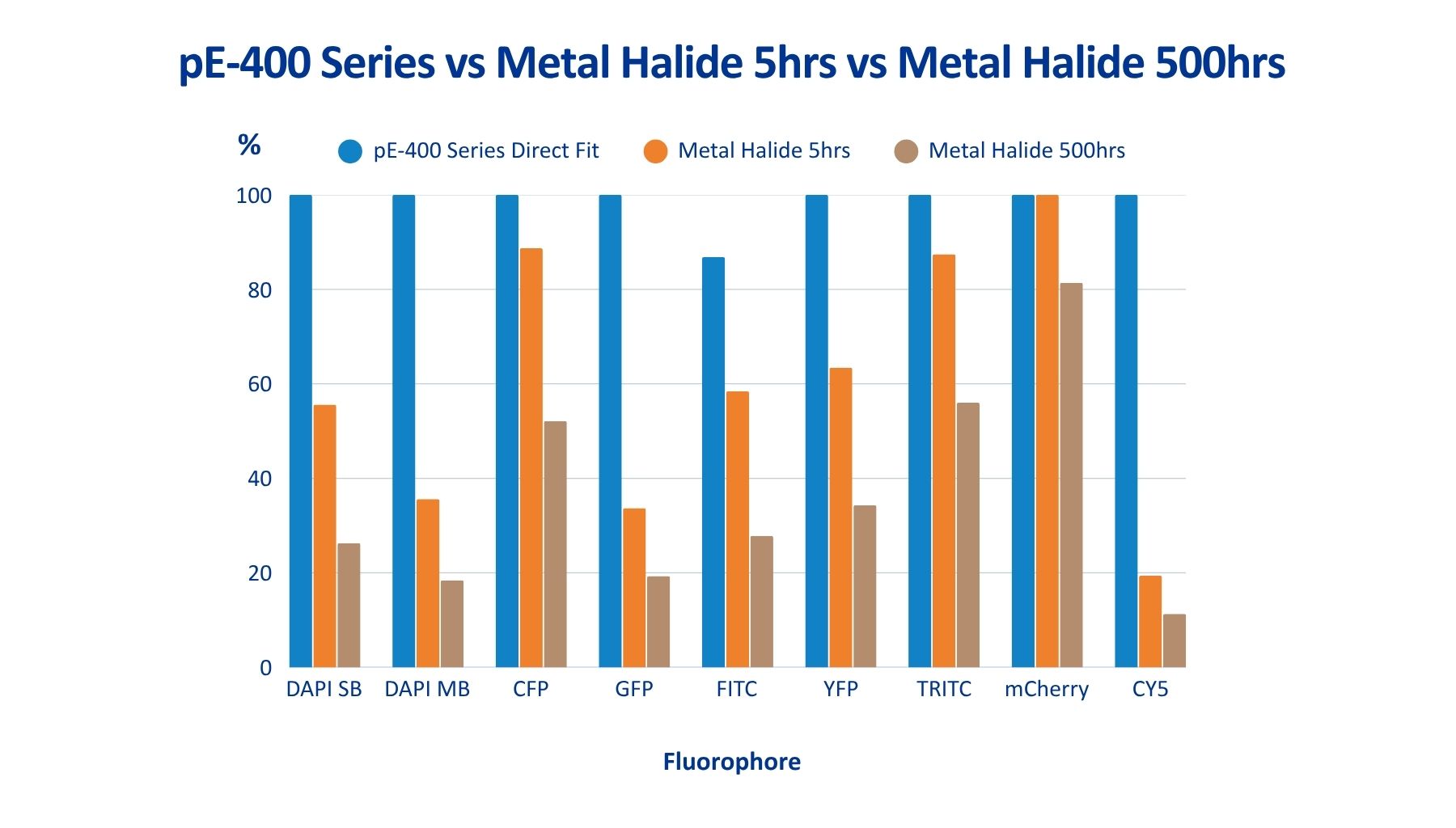 The difference can be clearly seen when comparing the pE-400 Series to a metal halide light source. After just 5 hours of use, a metal halide lamp shows a noticeable drop in power across common fluorophores. By 500 hours, output has degraded even further, in some cases to less than half of the original intensity.