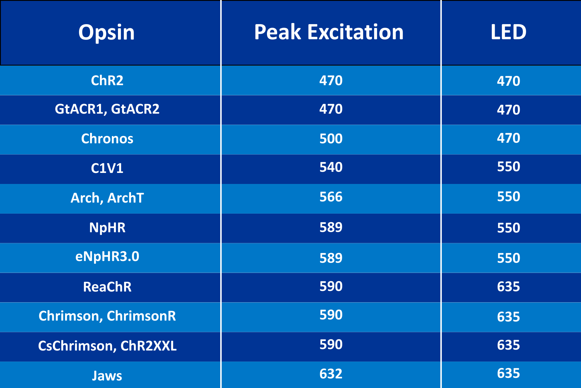 Three powerful LEDs – blue (470 nm), green-yellow (550 nm) and red (635 nm) – each can be optimised with inline excitation filters to match the most widely used opsins, including: