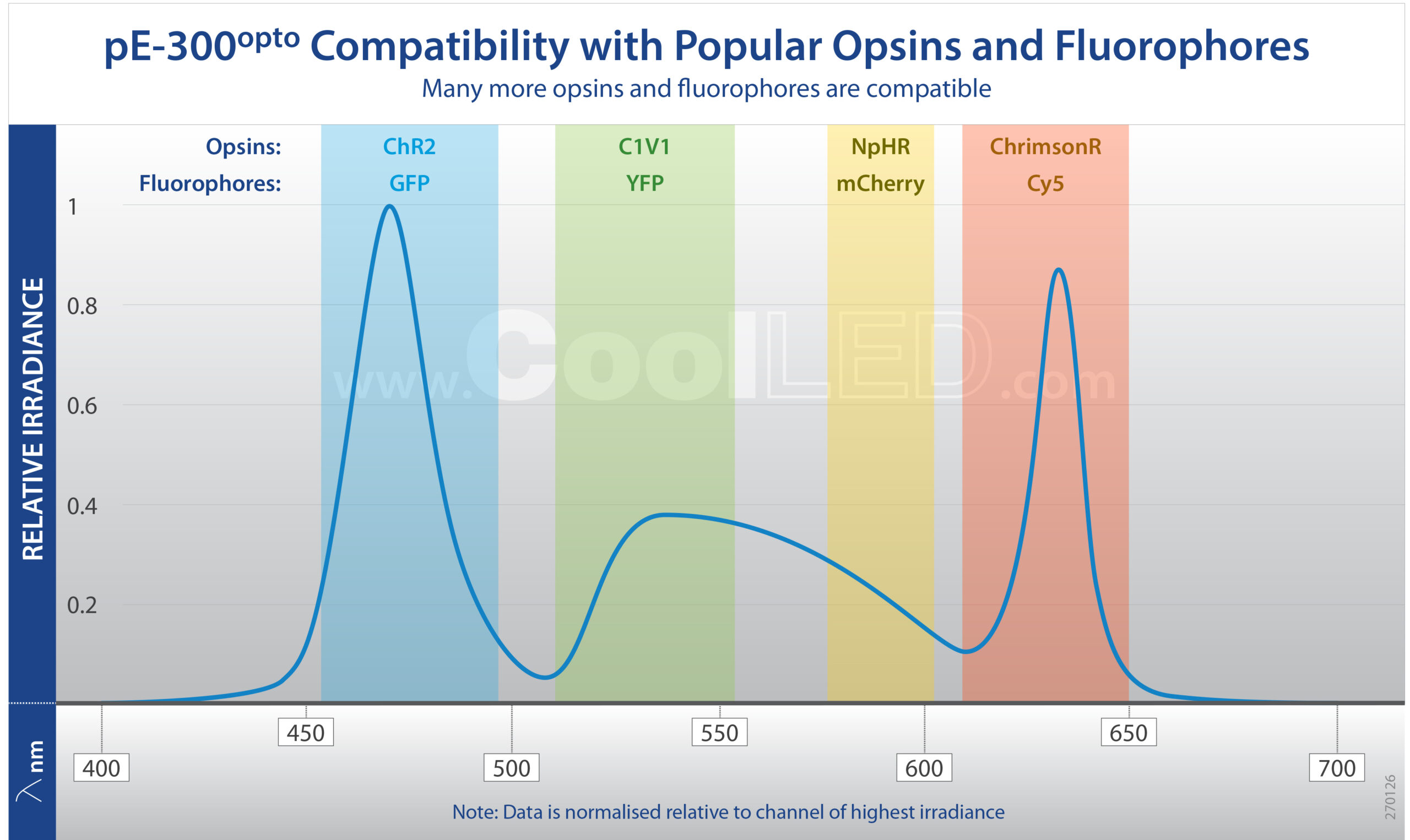 - Broad spectrum compatibility from Chr2 to ChrimsonR