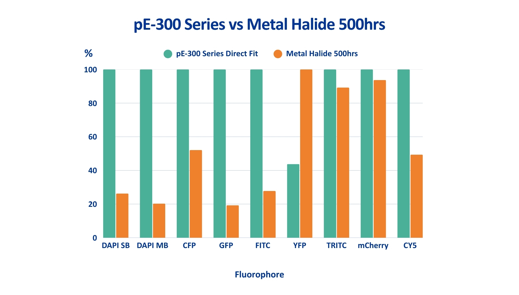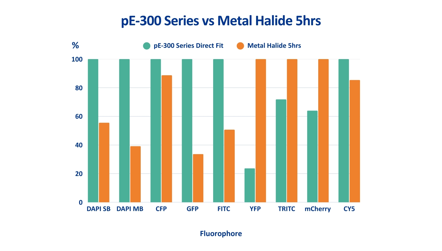 DAPI can be excited at either 365 nm or 400 nm and microscopes typically have a filter set which allows one or other of these wavelengths to be transmitted. To accommodate this, the pE-300ultra can be specified in one of two waveband configurations to match existing filter sets within the microscope.