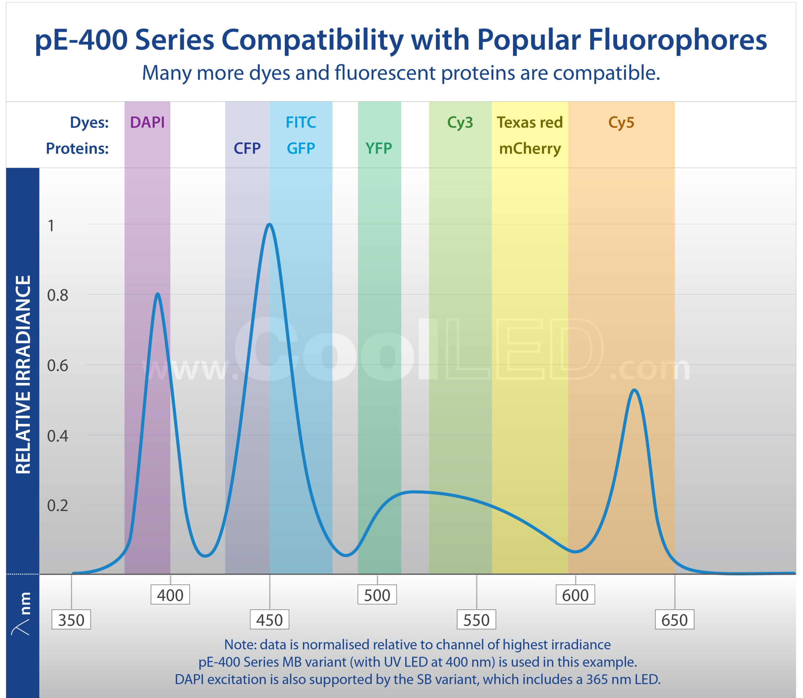 | pE-400 SB | Fluorescence | Single | 365 | 39000 AT DAPI/Hoechst/AlexaFluor 350 | LED-DAPI-B | |||