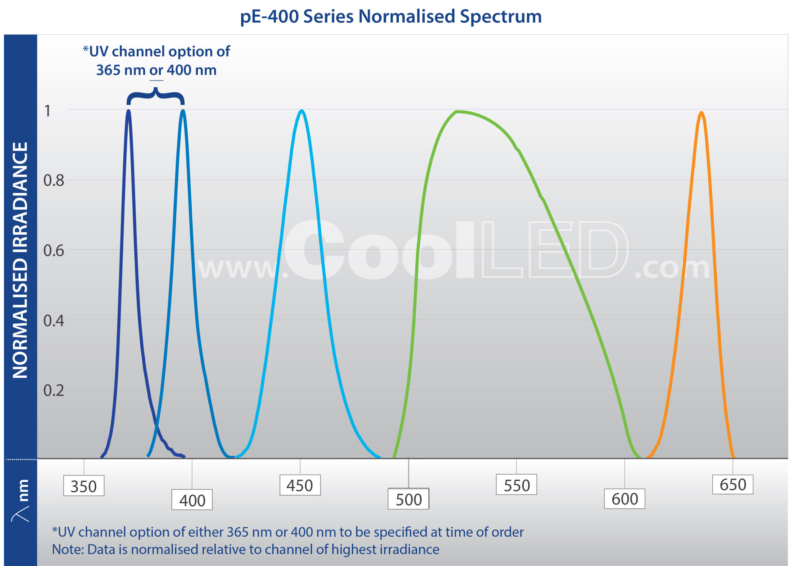 DAPI can be excited at either 365 nm or 400 nm and microscopes typically have a filter set which allows one or other of these wavelengths to be transmitted. To accommodate this, the pE-400max can be specified in one of two waveband configurations to match existing filter sets within the microscope.