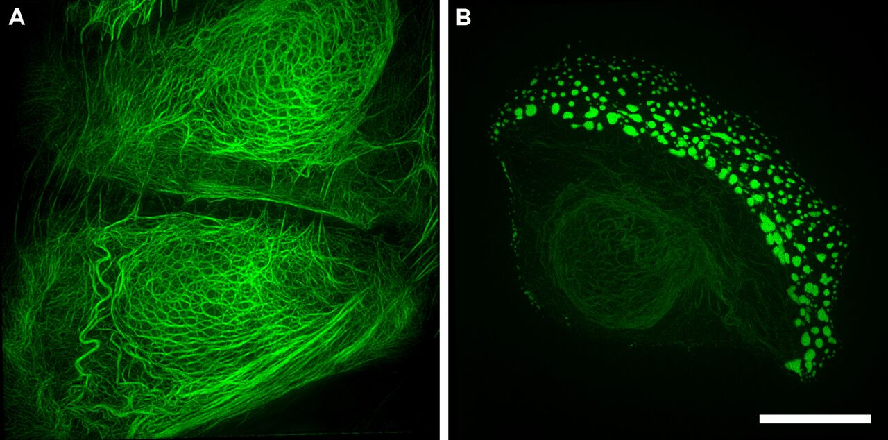 Figure 3. Structured illumination superresolution microscopy (3D-SIM) images of the GFP labelled keratin within (A) a wildtype and (B) a mutant keratinocyte cell. Acquired on a GE Healthcare DeltaVision OMX Blaze microscope. Scale bar = 10 μm.