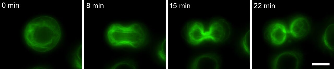 Figure 5. A keratinocyte undergoing mitosis in which the keratin is labelled with GFP.