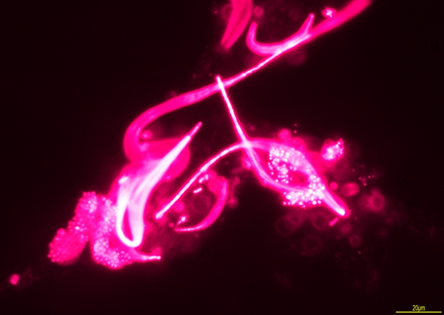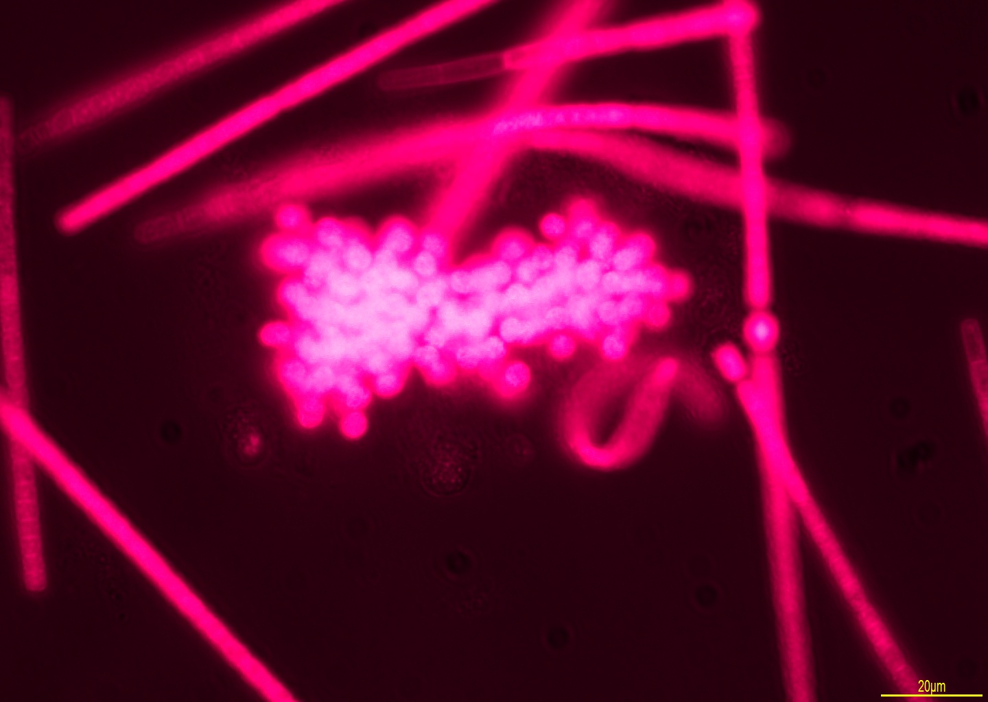 Unique pigments from cyanobacteria that auto-fluoresce at a specific wavelength, detected with the help of an optimised optical filter setup.