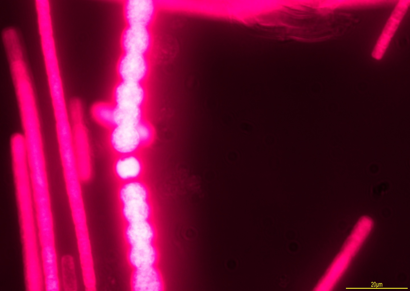 At the United States Environmental Protection Agency (USEPA) New England Regional laboratory, we use epifluorescence microscopy to detect pico cyanobacteria in water samples. We have a CoolLED pE-300lite Illumination System, utilizing optical filters to illuminate emission wavelengths produced by pigments found almost exclusively in cyanobacteria. This has been found to be very useful for the verification of pico cyanobacteria found in ambient waters that are difficult to see, much less identify under standard light microscopy. Pico cyanobacteria are in fact the smallest of all cyanobacteria, with a cell size of 0.2 to 2.0 µm.